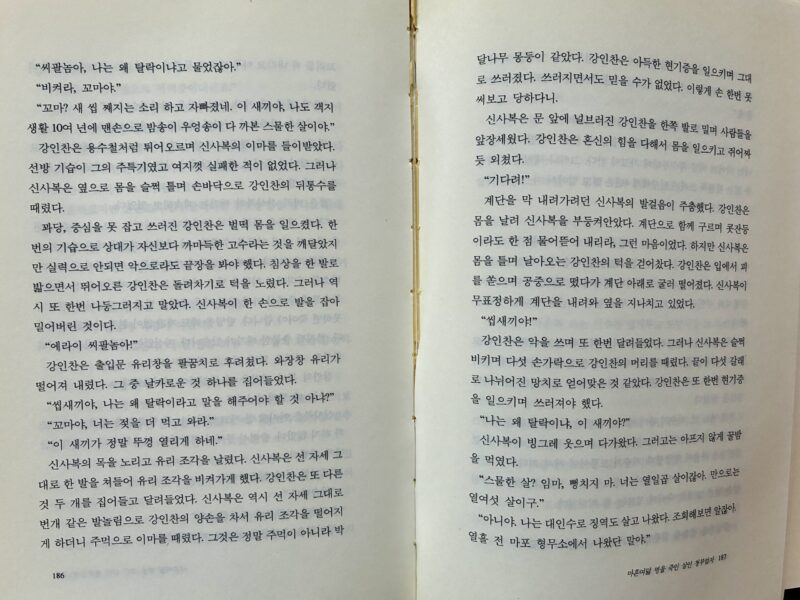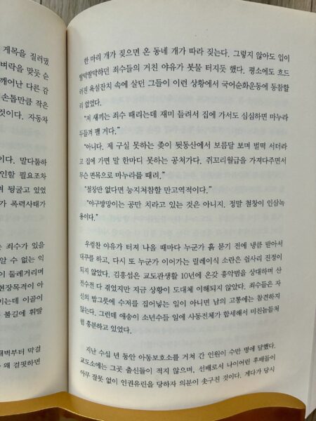 이 소설의 백미는 교도소라는 폐쇄 공간의 생생한 묘사에요. 일반인은 모르는 은어와 규칙들이 난무하죠.
